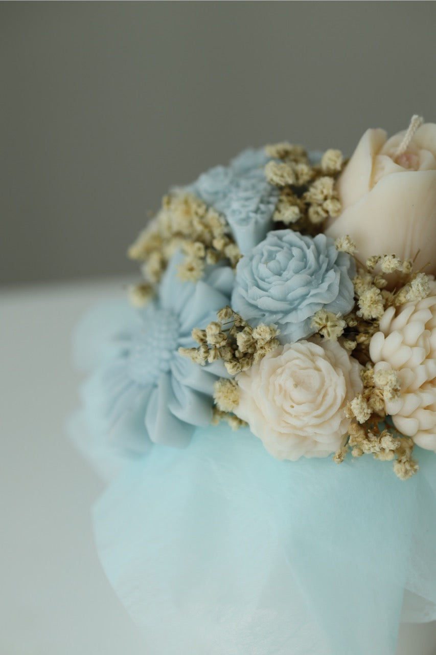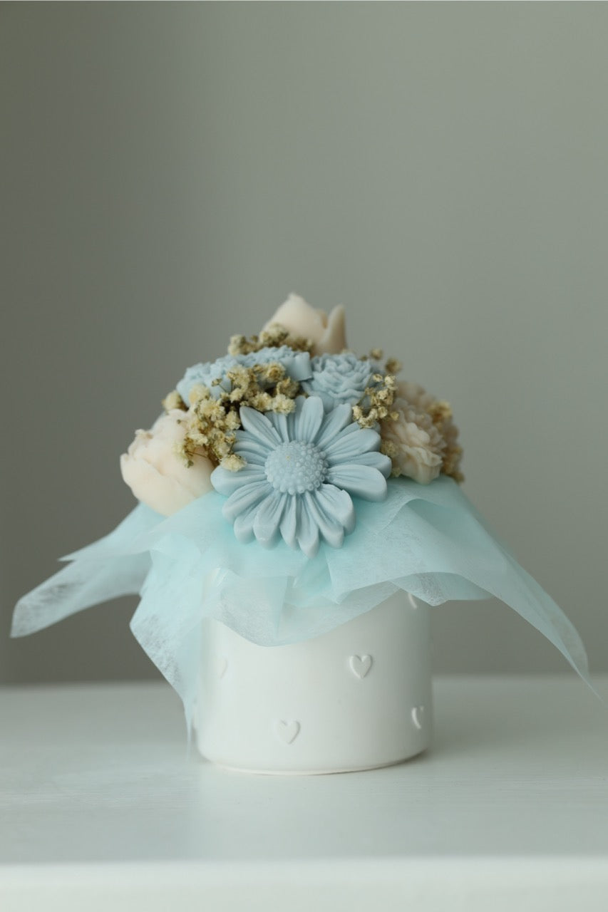 Tauche ein in die Welt von Bloom by SKARA – Raysin Edition.Dieser Kerzenstrauß wurde mit handgegossenen Blüten aus Rapswachs gefertigt und in einem selbst hergestellten Raysin-Topf mit filigranen Herzdetails arrangiert. So entsteht ein Arrangement, das nicht nur durch seine Blüten, sondern auch durch sein Gefäß zu einem besonderen Unikat wird.Verfeinert mit zartem Schleierkraut und abgestimmtem Seidenpapier ist dein Strauß ein liebevoller Blickfang – ganz ohne zu welken.